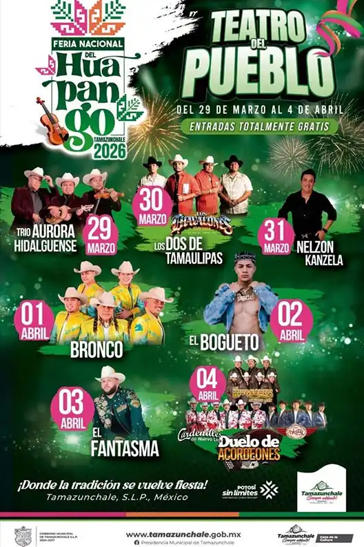 TamazunchaleFeria Nacional del Huapango29 de marzo al 04 de abril20:00 a 00:00 hrsUDETA483 112 1894Presidencia Municipal de Tamazunchale